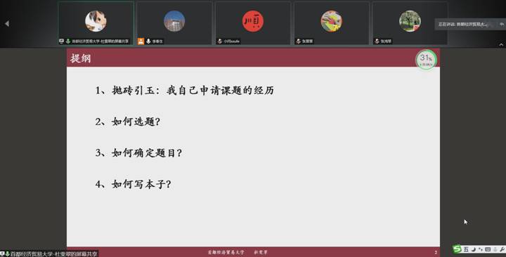 国民经济管理(劳动经济)系主任李春生老师邀请首都经济贸易大学经济学院副院长、博士生导师杜雯翠副教授做了以“如何实现国家级科研项目从0到1的突破”为主题的讲座。讲座以腾讯会议的形式进行,魔镜号
