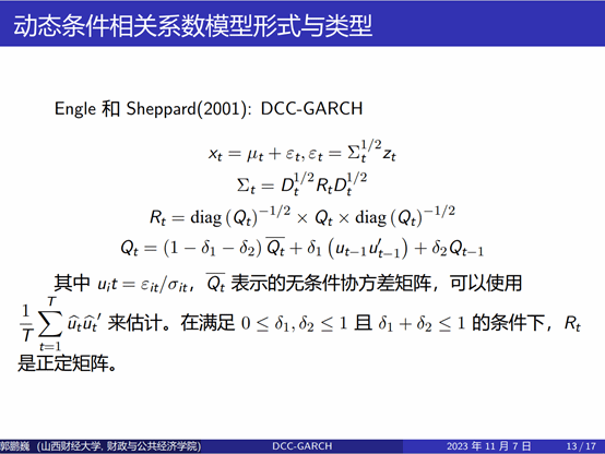 郭鹏巍同学以DCC-GARCH模型推导为主题进行分享,从ARCH和GARCH模型作为导入,引入了动态条件相关系数(DCC),进一步对动态条件相关系数模型的形式、类别以及优缺点进行了深入的分析,为大家展示了完整且全面的公式推导过程。康老师对于郭鹏巍同学的理论研究给予了肯定,表示自己也从中有所收获,并为同学们的毕业论文选择方向提出了宝贵的建议。